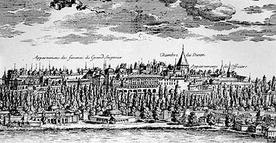 Рис. 1.45. Константинополь. Вид главного султанского дворца Топкапи на рисунке XVII века. Вероятно, название Grand Seigneur означало «Великий Князь», а Dwan – или как еще говорили Диван (то есть Государственный Совет при султане) – произошло от славянского ДУМА, «думан». Взято из [104], с. 110.