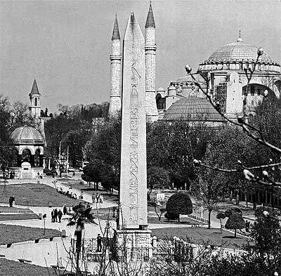 Но вернемся к большому обелиску Тутмеса III = Магомета II, находящемуся в Стамбуле. Он до сих пор стоит на Ипподроме, недалеко от большого храма Святой Софии. Считается, что этот обелиск был изготовлен в Египте, но впоследствии перевезен византийским императором Феодосием в Царь-Град.