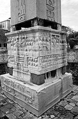 Кстати, сохранилась старая османская миниатюра XVI века с изображением этого обелиска, на которой пьедестал у обелиска совсем другой. На нем нет никаких барельефов и надписей, он выложен зеленым малахитом [1], т. 5, гл. 20:8. Кстати, не уральским ли? Сегодня же этот обелиск стоит на очень «античном» постаменте, относимом к эпохе императора Феодосия. Но судя по старой миниатюре, «античный» пьедестал для обелиска изготовили уже ПОСЛЕ XVI века.