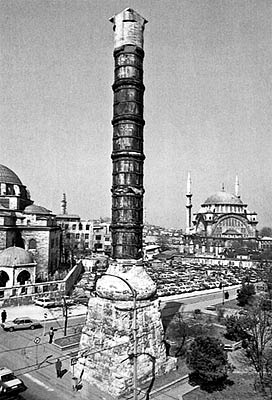 В 1996 году один из авторов настоящей книги Г.В. Носовский стоял около колонны Константина, снимая ее на видеокамеру. С ним заговорил пожилой турок и между прочим рассказал, что раньше этот гранитный столб был осью высокой ПОЖАРНОЙ КАЛАНЧИ. Вокруг столба вилась винтовая лестница, от которой до сих пор остались следы в виде железных обручей, охватывающих столб, на которые лестница крепилась.