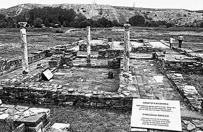 Кроме того, в сотне метров от них было раскопано также и другое очень интересное сооружение. Пояснительная табличка рядом с ним гласит: «Синагога-базилика. Христианская церковь IV–V веков, построенная поверх остатков более древнего иудейского храма II–IV веков ктитора Полихармоса», рис. 1.76.
