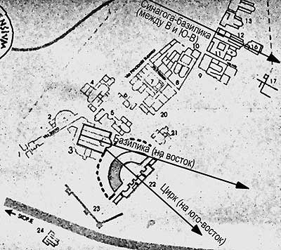 2) алтарь синагоги-базилики несколько развернут от юго-восточного направления в сторону чисто восточного,
