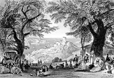 Рис. 3.11. Репродукция старой картины XVII–XIX веков, изображающей отдых стамбульских жителей на вершине Бейкоса, рядом с «могилой святого Иисуса» (вид от могилы). В центре картины виден Босфор, вливающийся в Черное море. На его берегу, на соседнем холме от Бейкоса в сторону Черного моря, стоят развалины мощной старинной крепости. Именно эти развалины являются, очевидно, центром всей композиции. Фотография 2006 года.
