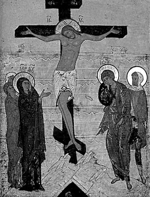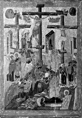 Рис. 3.31. Икона «Распятие» из иконостаса XVI века из церкви Преображения Господня в селе Спасское, под городом Переславлем (Ярославская область). За горой Голгофой, на которой стоит крест с распятым Христом, видны высокие крепостные стены Иерусалима. Город Иерусалим изображен недалеко от горы Голгофы, но все же стоит отдельно от нее. Взято из [114], т. 2, с. 127.