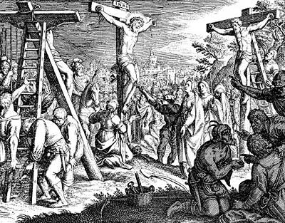 Рис. 3.36. Гравюра из немецкой Библии XVII века, изображающая распятие Христа и двух разбойников на горе Голгофе. С Голгофы хорошо виден город Иерусалим. Ср. с рис. 3.11. Как мы теперь понимаем, оба изображения показывают вид приблизительно с одного и того же места в одном и том же направлении. Это – вид с вершины «Исусовой горы» (Юша-Даг) на крепость Ерос. Взято из [118], с. 252.