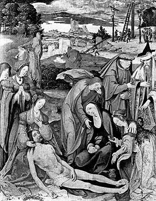 Рис. 3.40. «Оплакивание тела Христа». Голландский мастер Geertgen tot Sint Jans, якобы 1484 год. Картина хранится в художественно-историческом музее города Вены. Недалеко от Голгофы, на соседнем, более низком холме расположена крепость – город Иерусалим. Именно так взаимно расположены «Исусова гора» (Юша-Даг) и крепость Ерос на Босфоре. Взято из [117], tafel 268.