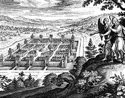 Рис. 3.42. «Новый Иерусалим». Гравюра из немецкой Библии XVII века. Идеальный город Новый Иерусалим показан стоящим в местности, очень напоминающей северные берега Босфора. Река или пролив течет среди высоких холмов. Места вокруг крепости Ерос – именно такие. Взято из [118], с. 297.