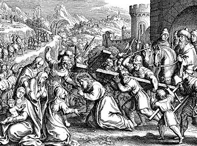 Рис. 3.43. Немецкая гравюра XVII века, изображающая путь Христа от Иерусалима до Голгофы. Изображение на гравюре в точности соответствует взаимному расположению Ероса-Иерусалима и «Исусовой горы» (Юша-Даг) – Голгофы. Ср. с фотографией на рис. 3.46, где показан вид на «Исусову гору» от ворот Ероса-Иерусалима. Взято из [118], с. 250.