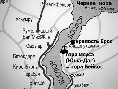 И действительно, гора Бейкос (Голгофа) и крепость Ерос-Иерусалим расположены на двух соседних мысах, выступающих с азиатского берега Босфора у его впадения в Черное море, рис. 3.45. Расстояние от крепости до «могилы святого Иисуса» на вершине Бейкоса – около двух часов пешком (15–20 минут на машине). Бейкос-Голгофа находится в прямой видимости от Ероса-Иерусалима и наоборот, см. рис. 3.11, 3.46, 3.47. Все это прекрасно соответствует евангельским описаниям, согласно которым Голгофа находилась не в самом Иерусалиме, но рядом с ним.