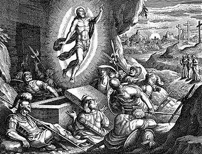 Рис. 3.50. Немецкая гравюра XVII века, изображающая Воскресение Христа. Гора Голгофа стоит на берегу реки или пролива. В точности соответствует расположению крепости Ерос на Босфоре. Взято из [118], с. 253