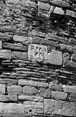 Рис. 3.52. Каменная доска с христианской символикой на южной воротной башне Ероса. Доска, очевидно, достаточно новая, поставленная здесь реставраторами. Хотелось бы увидеть подлинную старую доску, которая была здесь раньше. Но нам ничего не удалось узнать о ее местонахождении и, вообще, – сохранилась ли она. Фотография 2006 года.