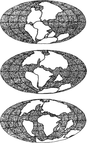 Рис. 33. Геологическая наука утверждает, что 200 миллионов лет назад масса Земли была соединена в единое целое в одном месте. На протяжении миллионов лет эта суша разломилась и постепенно достигла положения теперешних континентов.