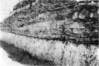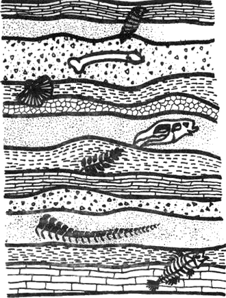 Земная кора сильно изменилась в то время за счет многочисленных поднятий и опусканий (рис. 40). Поднялись горы и опустились долины (Псалом 103:8). Целые цивилизации были поглощены землей (Иез. 26:19–20). Области, когда–то служившие дном океана, превратились в пустыни. Все это произошло во всем мире в течение нескольких месяцев (Быт. 8:2, 3, 5). Воды стали убывать, и волны перекатывались по поверхности земли, перенося растительный и животный материал. Все это перемешалось между собой, а также смешалось с вулканическим пеплом, вулканической грязью и другими осадками. Приливные волны, несущие погибшие растения и тела животных, откладывали их горизонтальными слоями. В течение очень короткого промежутка времени образовались отложения толщиной в тысячи метров. По мере поднятия и опускания суши откладывался слой за слоем (рис. 41). Формы растительной и животной жизни перемешивались, разрывались и беспорядочно погребались в этих слоях (рис. 42).