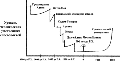 Рис. 43. Приведенная схема, отражающая период приблизительно в 6 тысяч лет, показывает библейскую летопись истории человечества. Бог многочисленными катастрофами карал цветущую цивилизацию, впавшую в сатанинские пороки.