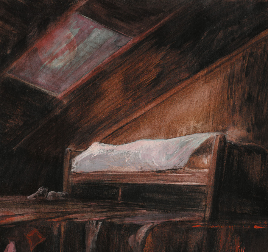 Комната Гилману досталась просторная, зато до странности несимметричная; северная стена заметно покосилась внутрь по всей длине, а низкий потолок шел вниз, под уклон, в том же самом направлении. Если не считать явной крысиной норы и следов других таких же, заделанных, не было никакого доступа (и никаких следов того, что такой проход когда-либо существовал) к зазору, что, по-видимому, образовался между покосившейся внутренней стеной и ровной внешней стеною дома с северной стороны. Хотя, если посмотреть снаружи, можно было разглядеть, что здесь когда-то в незапамятные времена заколотили досками окно. К чердаку над потолком, с покатым, по всей видимости, полом, – в этом месте доступа тоже не было. Когда же Гилман вскарабкался по приставной лестнице на затянутый паутиной чердак, там, где над остальной частью мансарды пол был ровным, он обнаружил следы былого отверстия, которое надежно, просто-таки намертво забили старыми досками с помощью крепких деревянных гвоздей, что были в ходу у плотников колониального периода. Однако ж Гилману так и не удалось убедить флегматичного домохозяина позволить ему исследовать какую-либо из этих заделанных пустот.