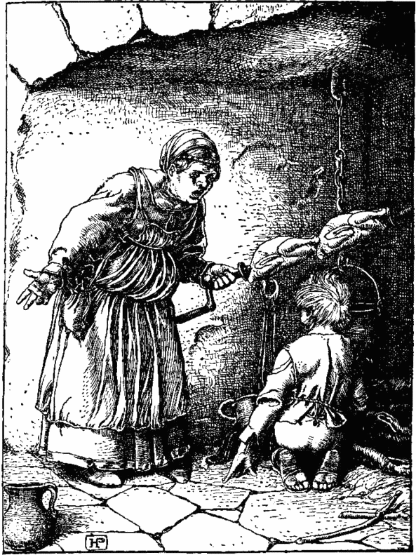 – Сейчас или никогда, – сказал себе Ганс. Расставив локти так, чтобы они уперлись в стенки трубы, он выпрямил ноги, приготовившись к прыжку. От его движений лавина сажи посыпалась на хворост, который уже полыхал внизу. Мальчик в недоумении поднял голову. Но тут Ганс опустил руки и – хлоп! – удачно приземлился среди горящих вязанок.