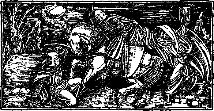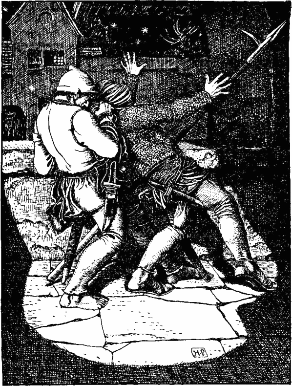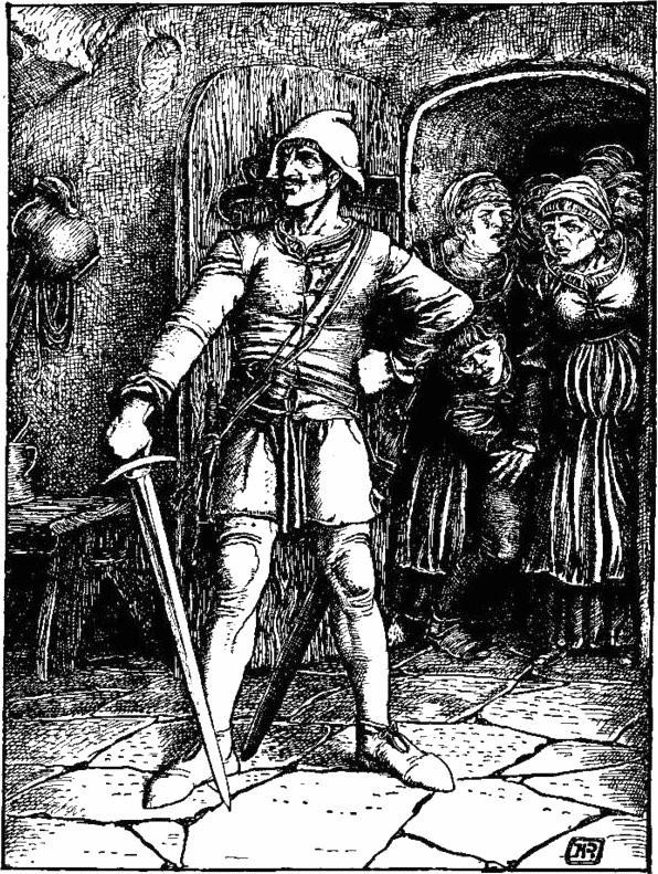 Поваренок, сидевший на корточках у огня, опрокинулся на спину и замер на полу с лицом белее муки. Остекленевшими от страха глазами взирал он на черного как сажа детину, спокойно стоявшего в дыму и пламени. Затем страшная догадка осенила его: «Да ведь это сам дьявол!», и с диким воплем, откатившись от очага, поваренок опрометью вылетел за дверь. Не переводя дух, он промчался через переход, продолжая кричать и не смея обернуться назад от ужаса.