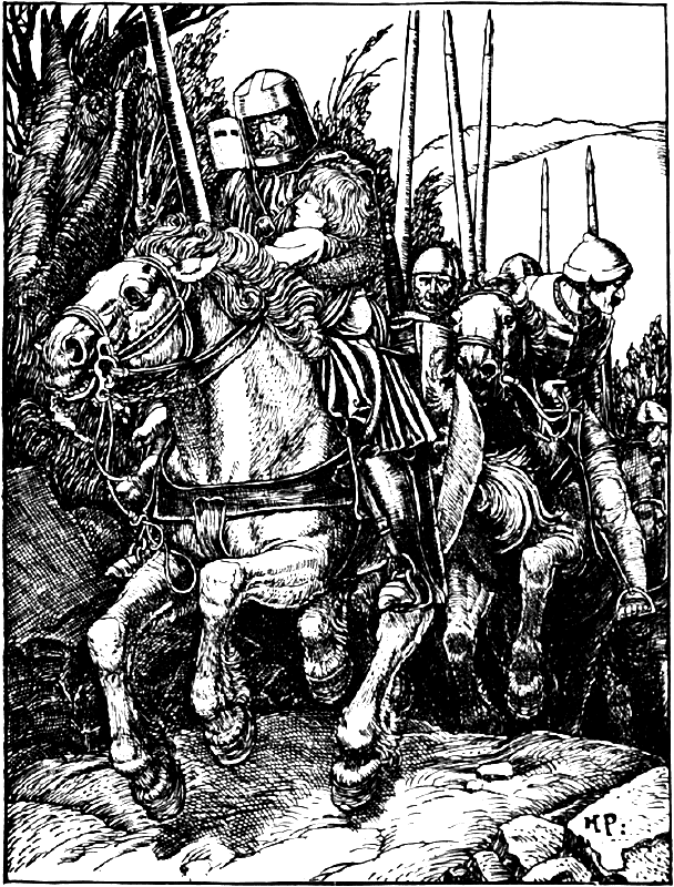 Наконец, в коридоре появился барон Генри в походном снаряжении, которое он поспешно надел, как только узнал, что его пленника похитили. Конь уже поджидал его во дворе, и он мигом взлетел ему на спину. Не теряя времени, барон Генри бросился в погоню за беглецами, а его люди устремились за ним следом. Оружие на них устрашающе звенело, острые мечи бряцали, а железные копыта лошадей высекали искры из камней, когда всадники во всю прыть неслись по дороге.