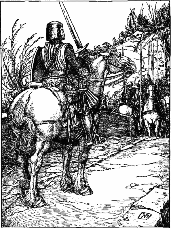 Как только последний из спутников барона скрылся за поворотом дороги и исчез из вида, он постарался взять себя в руки и отогнать тягостные мысли. Медленно двинулся он к середине моста навстречу преследователям. Здесь барон остановился, опустил забрало, укрепив его получше, и проверил, легко ли выходят из ножен меч и кинжал.