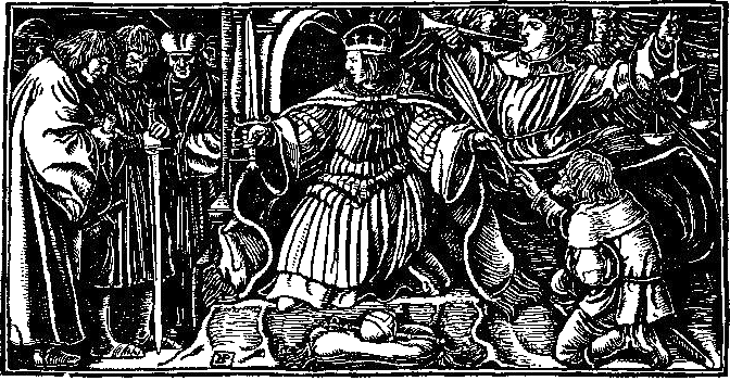 – Ваше Величество, – ответил аббат, – мы смиренно подали прошение от имени Вашего вассала, барона Конрада из рода Вульфов из Замка Отважного Змея. Он недавно побывал при дворе и принял присягу. Он просит Вашей справедливости и заступничества для своего сына, которого Вы видите перед собой. Юный барон лишился своих владений – его замок был сожжен, а сам он заперт в темнице и жестоко искалечен врагом своего отца – бароном Генри из рода Родербургов из Замка Змеелова.