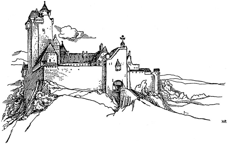 Конский топот и звон упряжи! Это одинокий рыцарь в полном вооружении ехал верхом по крутой дороге, которая петляла то влево, то вправо среди виноградников на склонах Санкт-Михаэльсбурга. Полированный шлем и латы сверкали на полуденном солнце, ибо в те дни ни один рыцарь не осмеливался ездить по дорогам, иначе как в полном боевом доспехе. Рыцарь держал сверток, прикрытый складками грубого серого плаща.