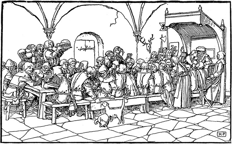 Затем на какое-то время во дворе замка воцаряется тишина, кукарекает петух, повар ругает ленивую помощницу, а какая-нибудь Гретхен, облокотившись на подоконник, напевает песенку, словно это мирная ферма, а не притон грабителей.