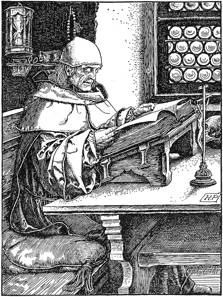 Барон Конрад вошел в комнату с высоким сводчатым потолком, на другом конце которой стоял у стола аббат Отто. Из эркерного окна позади старика на него лились лучи света и, казалось, его тонкие седые волосы охвачены золотым сиянием. Его белая, изящная рука лежала на столе на листах пергамента, покрытых рядами древнегреческих письмен, которые он разбирал.