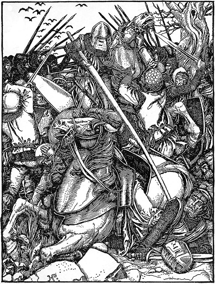 Затем следовал шум, суета и спешка во дворе замка внизу; люди кричали и звали друг друга, раздавался звон доспехов и стук лошадиных копыт по твердому камню. Скрипела лебедка, медленно поднималась решетка с железными шипами, и с лязгом и звоном железных цепей падал подъемный мост. По нему с грохотом проносились кони и люди, затем спускались вниз по извилистой каменистой тропе, пока огромный лес не поглощал их, и они не исчезали.