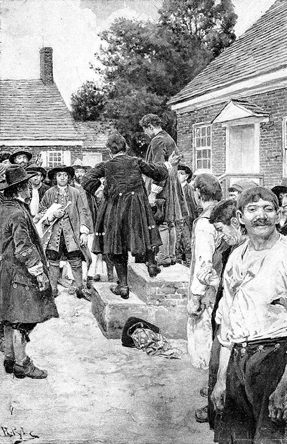 Небольшая группа людей стояла на пристани, ожидая плоскодонку. Когда она с глухим шумом ударилась о сваи, полдюжины услужливых рук подхватили брошенный канат и закрепили его. Джек вместе с остальными вскарабкался на причал под любопытными взглядами тех, кто стоял и наблюдал за происходящим. Они выстроились в два ряда, а затем двинулись по причалу к берегу. Зеваки последовали за ними. За пристанью они пересекли узкую полоску побережья и поднялись по пологой песчаной дороге, прорезавшей высокий берег. На верху склона они вышли на широкую, поросшую травой улицу, вдоль которой были разбросаны дома, один или два из которых были построены из кирпича, но большинство из них представляли собой некрашеные каркасные строения с высокими остроконечными крышами и кирпичными трубами. В воздухе витал тонкий запах дыма. Люди стояли у своих дверей, глядя на Джека и его спутников, пока они по двое маршировали по центру пыльной улицы.