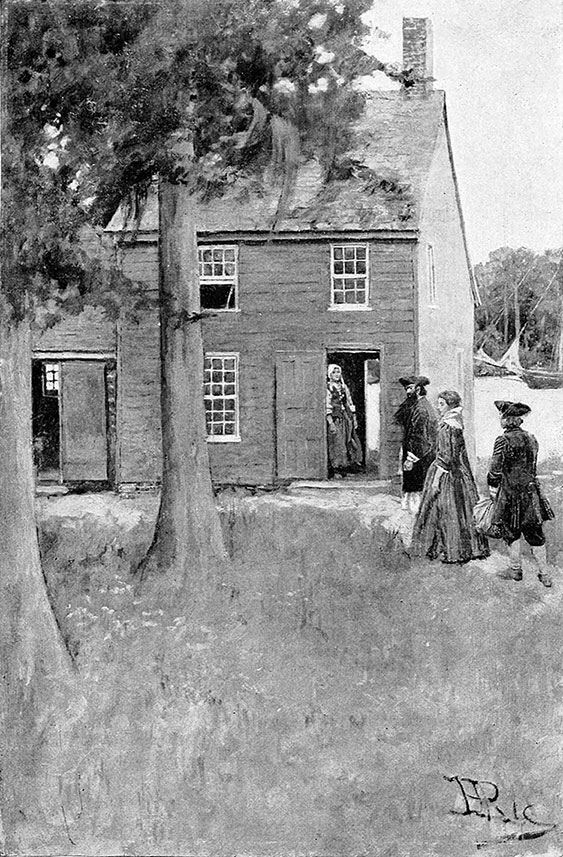 Дорога из Норфолка в Бат заняла почти неделю. Шлюп пришел в Окракок перед рассветом четвертого дня, с шумом и сумятицей избавился от почти всей своей команды в непроницаемой серости рассвета, а затем уплыл вверх по проливу, взяв с собой только капитана пиратов, Дреда, Хэндса, Джека и двух негров вместо тридцати или более человек, составлявших команду судна. На рассвете следующего дня шлюп развернулся и вошел в устье Бат-Крик. С одной стороны было болото, окаймленное гигантскими кипарисами, их ярко-зеленая листва выделялась на фоне более темной зелени деревьев позади. На другой стороне были расчищенные пространства с плантациями. Примерно в полулиге вверх по течению, в начале устья ручья, среди деревьев на пологом возвышении теснились дома маленького городка. Шлюп плавно подплывал все ближе и ближе к обрывистому берегу, на котором стоял квадратный каркасный дом с высокой покатой крышей и двумя узкими трубами. Это здание, которое, казалось, был несколько лучше, чем обычный деревянный дом простого поселенца, почти скрывала тень двух больших кипарисов, которые росли в небольшой болотистой лощине. За ним виднелось расчищенное пространство, простиравшееся до края леса. Ялик и шлюпка были вытащены на берег недалеко от причала, и Джек видел двух белых мужчин грубого вида, стоявших на причале и смотревших в сторону шлюпа. Сам он стоял рядом с двумя неграми, которые теперь составляли команду, готовый помочь снять якорь по команде, и тут Дред вышел из каюты и прошел по палубе туда, где он стоял.