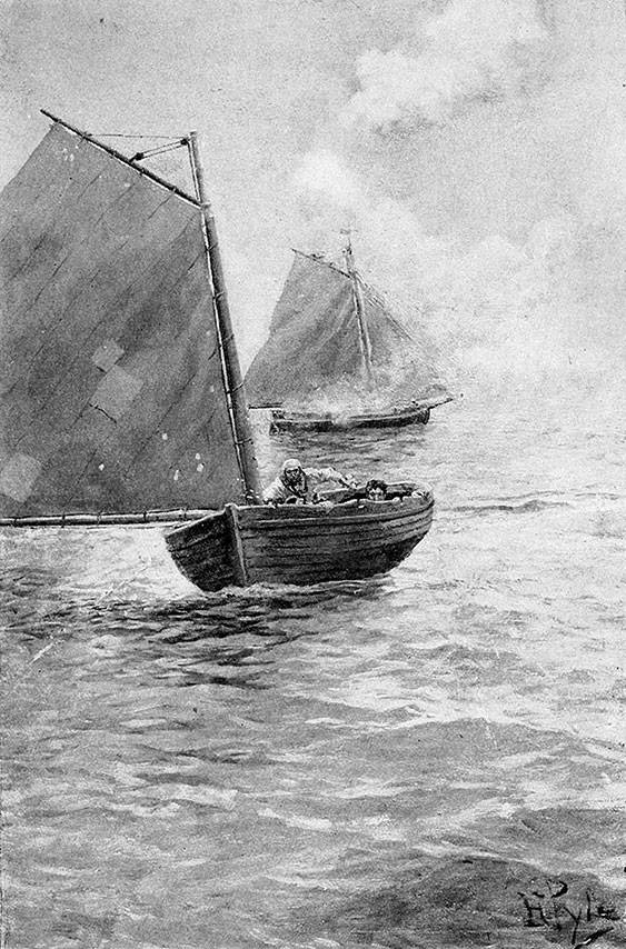 – Там, у них, дует ветерок, – сказал он. – Они поднимают паруса. Похоже, ветер будет у них раньше, чем у нас. Нам повезло, что мы так близко к заливу. – Он снова занял свое место. – Греби, парень, – сказал он. – Я думаю, мы в полной безопасности, но надо знать это наверняка. Как только мы доберемся до бухты, мы сможем отдыхать целый день.