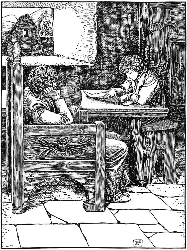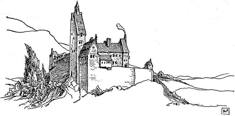 Однажды двое незнакомцев галопом пронеслись по извилистой тропинке к воротам Драконова Дома. Раздался тонкий и ясный звук рожка, и через пропасть на дороге между двумя незнакомцами и привратником, появившимся у маленького окошка, начались переговоры. Затем к барону послали гонца, и вскоре он широкими шагами пересек открытый двор и направился к воротам, чтобы переговорить с незнакомцами.
