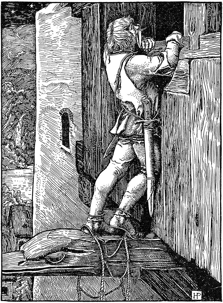 Молодой человек поплевал на руки и, схватившись за веревки, начал медленно и осторожно подниматься по шаткой, дрожащей лестнице. Те, кто был внизу, держали ее изо всех сил, но, несмотря на это, парень раскачивался взад и вперед, из стороны в сторону, неуклонно поднимаясь вверх. Один раз он остановился по дороге, и те, кто был внизу, видели, как он крепко вцепился в лестницу, как будто у него закружилась голова, но опять начал подниматься, подниматься, и подниматься, словно большой черный паук. Вскоре он вылез из лежащей внизу черной тени на белый лунный свет, и его тень следовала за ним шаг за шагом вверх по серой стене. Наконец он добрался до выступающей балки и там, крепко вцепившись в нее, снова остановился. В следующее мгновение он уже сидел верхом на балке, подобравшись к окну бартизана. Медленно приподнявшись на узкой опоре, он осторожно заглянул внутрь. Наблюдавшие за ним снизу видели, как он плавно отвел руку в сторону, а затем зажал что-то зубами. Это был кинжал. Протянув руку, он ухватился за подоконник и, бесшумно подтянувшись, запрыгнул на него. В следующее мгновение он исчез внутри. Последовало несколько секунд тишины, затем раздался резкий захлебывающийся вскрик. Последовала еще одна пауза, затем сверху раздался тихий короткий свист.