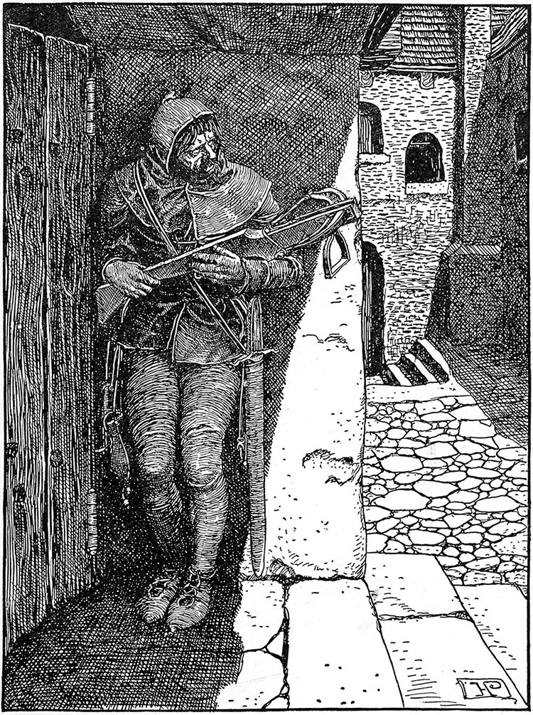 Черный Карл не раздумывал ни минуты. В те дни отнять чужую жизнь не считалось делом, заслуживающим долгих размышлений или тревог. Черный Карл мог бы застрелить человека по гораздо меньшему поводу, чем подозрительные действия этого парня. В лунном свете одетая в кожу фигура была прекрасной мишенью для стрелы из арбалета. Черный Карл медленно поднял оружие к плечу и тщательно прицелился. В этот момент незнакомец приложил пальцы к губам и быстро тихонько свистнул. Это был последний свист в его жизни. Раздался резкий звон тетивы, шипение летящей стрелы и глухой стук, когда она попала в цель. Мужчина издал пронзительный крик, покачнулся, а затем рухнул всей тяжестью на стену позади. Как будто в ответ на крик, полдюжины мужчин с шумом выскочили из тени ворот, откуда только что вышел незнакомец, а затем остановились во дворе, неуверенно оглядываясь по сторонам, не зная, с какой стороны раздался удар, повергший их товарища на землю.