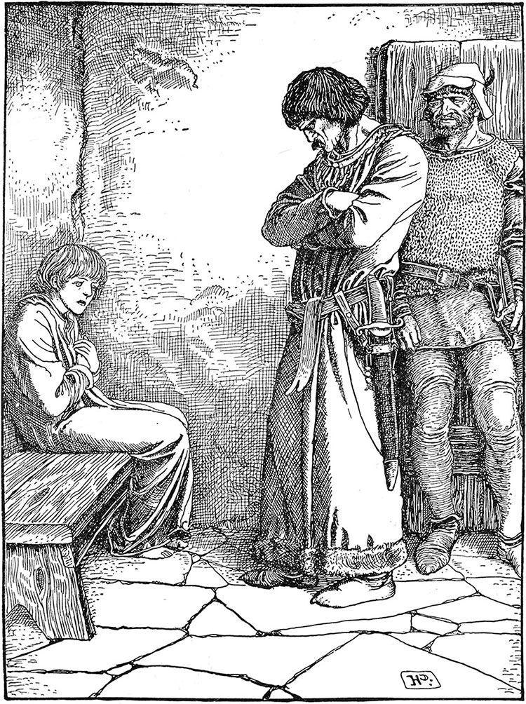 В комнате вспыхнул красный свет, и в дверном проеме появилась высокая худая фигура в сверкающей кольчуге. За спиной этого свирепого рыцаря с темным, узким, жестоким лицом, глубоко посаженными глазами, блестевшими в свете факелов, толпились шесть или восемь свирепых, мрачных мужчин, которые, заглядывая в комнату, таращились на бледного мальчишку у окна и старуху, которая вцепилась в его колени и молила о помощи.