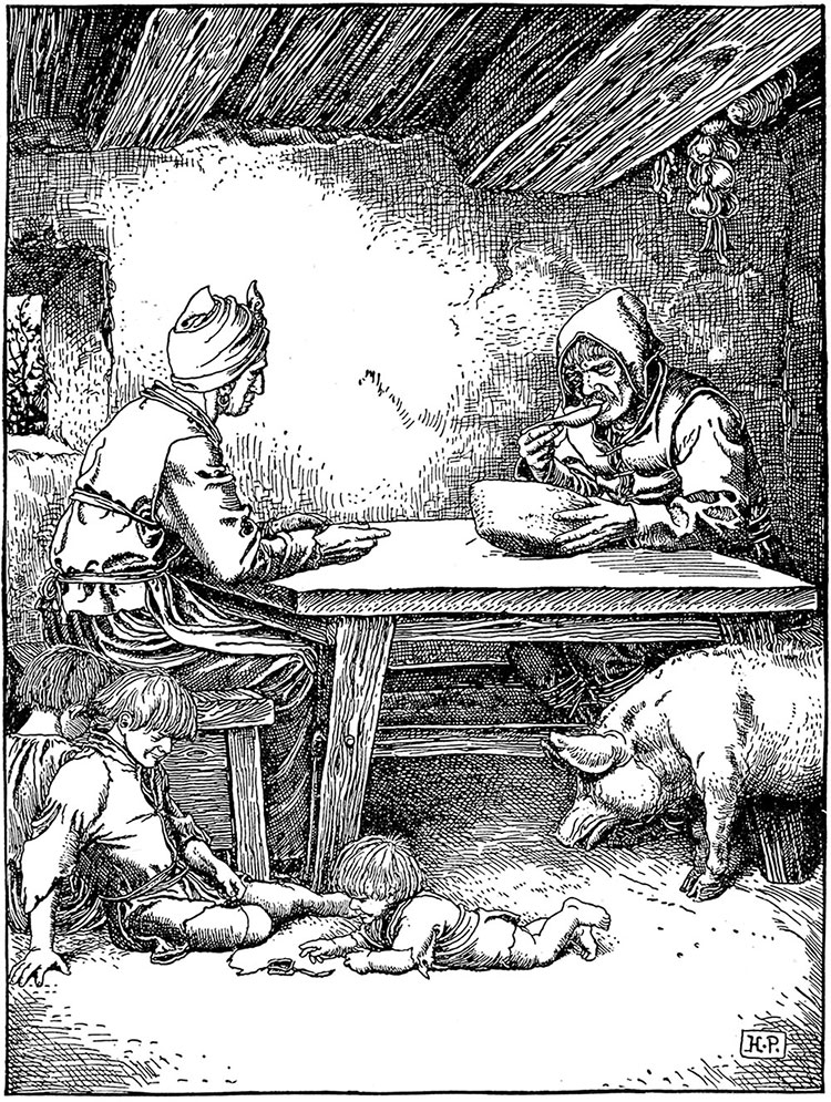 Поздним вечером Фриц, свинопас, сидел за столом и ел овсянку из большой деревянной миски. Его жена Катрина сидела на другом конце стола, а полуголые маленькие дети играли на земляном полу. Перед камином, свернувшись калачиком, лежала лохматая собака, а поросенок, хрюкая, чесался о ножку грубого стола рядом с тем местом, где сидела женщина.