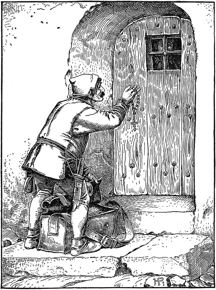 Девушка смотрела и колебалась, но искушение было слишком велико. Послышался звук мягко отодвигаемых засовов, дверь немного приоткрылась, и в мгновение ока Одноглазый Ганс проскользнул внутрь со всем своим снаряжением.