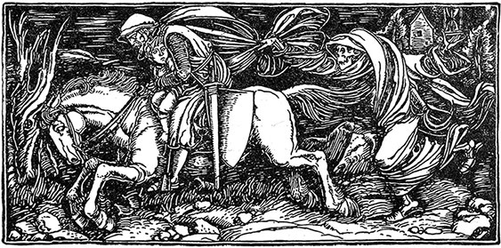 В замке Труц-Дракен царили суета и суматоха: мигающие факелы освещали тускло-серые стены; лошади ржали и били копытами, а люди перекликались друг с другом. Вскоре по коридору широкими шагами прошел барон Генрих, облаченный в легкие доспехи, которые он поспешно надел, разбуженный известием о побеге пленника. Внизу, во дворе, стоял его конь, и, не дожидаясь помощи, он вскочил в седло. Затем они все поскакали по крутой тропинке, звеня доспехами, звеня мечами и подкованными железом копытами, выбивающими искры из камней. Во главе отряда ехал барон Генрих; его треугольный щит висел на плече, а в руке он держал длинное, тяжелое, стальное копье с трепетавшим у острия вымпелом.