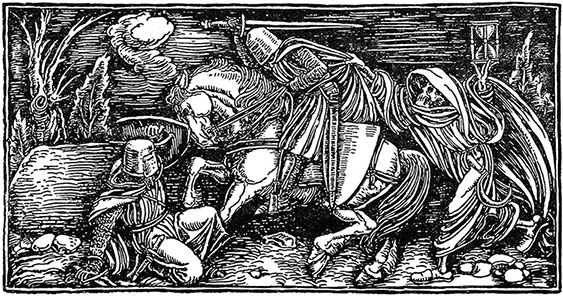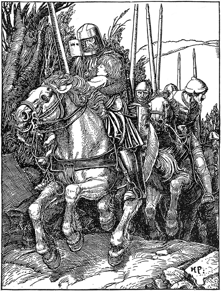 Преследователи неслись вниз по крутой тропинке с холма. Спустившись к мосту, они натянули поводья, потому что путь им преградила неподвижная закованная в сталь фигура на огромном боевом коне, тело которого было покрыто потом и пятнами пены, а широкие, красные ноздри тяжело раздувались.