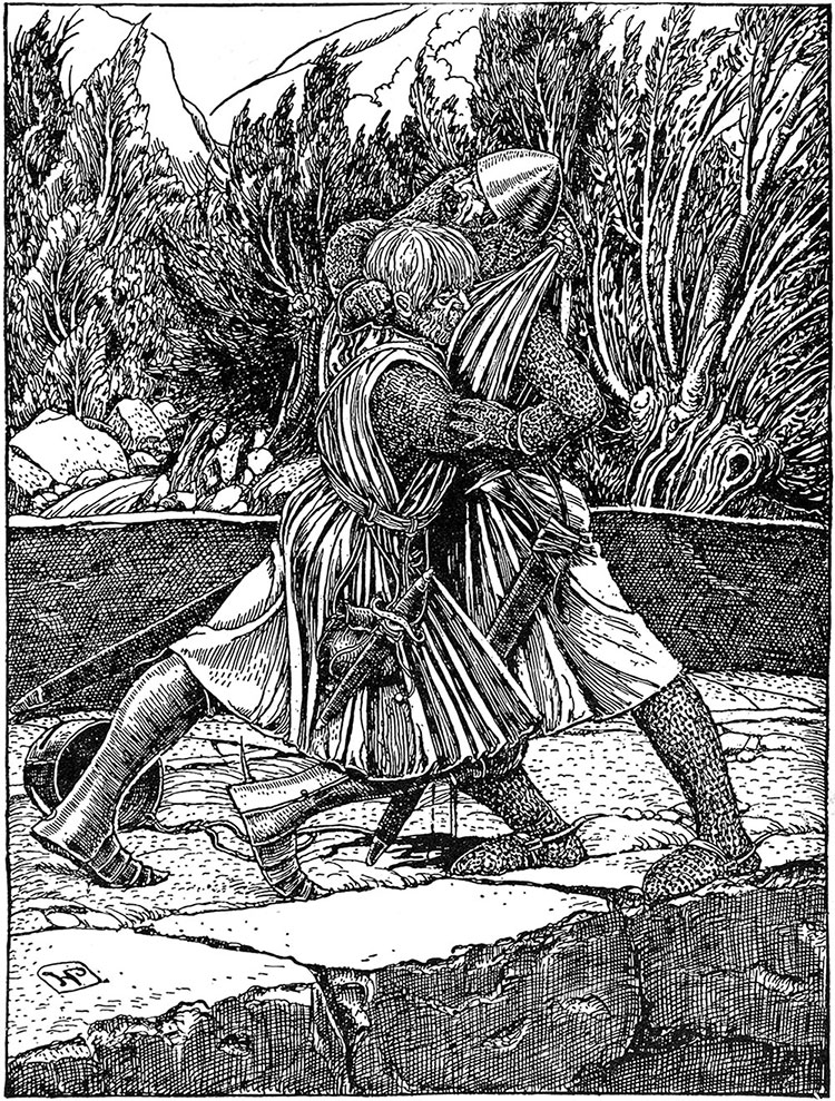 – Вперед! – закричал предводитель людей из Труц-Дракена, и они поскакали к сражающимся рыцарям, чтобы спасти своего хозяина. Но опоздали.