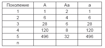 Сделанное Гэртнером, Кёльрейтером и другими открытие, что гибриды обладают склонностью возвращаться к родоначальным формам, подтверждается вышеупомянутыми опытами. Можно показать, что число гибридов, явившихся в результате одного оплодотворения, начинает от поколения к поколению значительно отставать от числа сделавшихся константными форм и их потомков, но совсем исчезнуть гибриды не могут. Если мы допустим в среднем для всех растений во всех поколениях одинаковую плодовитость и примем дальше, что каждый гибрид образует семена, из которых наполовину опять выходят гибриды, наполовину же константные формы с поделившимися поровну обоими признаками, то численные отношения для потомков в каждом поколении вытекают из нижеследующей сводки, где А и а опять образуют оба исходных признака и Аа – гибридную форму. Для краткости можно предположить, что каждое растение образует в каждом поколении только 4 семени.