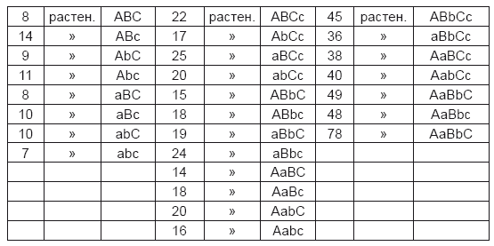 АВС + АВс + АbС + Abc + аВС + аВс + abC + abc + 2АВСс + 2АbСс + 2аВСс + 2аbСс + 2АВbС + 2АВbc + 2аВbС + 2аВbс + 2АаВС + 2АаВс + 2АаbС + 2Ааbс + 4АВbСс + 4аВbСс + 4АаВСс + 4АаbСс + 4АаВbС + 8АаВbс + 8АаВbСс.