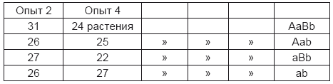 В каждом из этих четырех опытов на трех растениях были оплодотворены все цветы. Если вышеизложенное предположение было правильно, то на гибридах должны были развиваться зачатковые и пыльцевые клетки форм АВ, Аb, аВ, аb, и тогда соединялись: