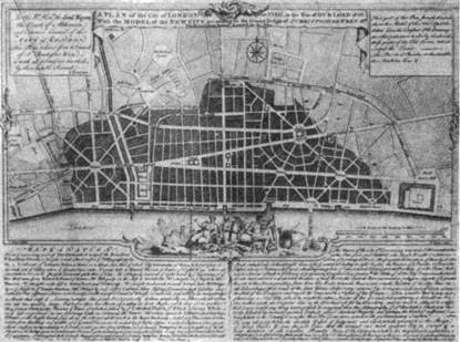 Рен, недавно вернувшийся из Парижа, где он изучал неоклассическую архитектуру, а также современные планы городской застройки, мечтал заменить извилистые улочки и дворы старого средневекового города новыми монументальными проспектами, похожими на те, которые он видел во Франции. Главным элементом его плана был центральный проспект, тянувшийся практически по прямой линии от одного края города (Олдгейт) до другого (Стрэнд), проходя по пути через несколько огромных звездообразных площадей. От этих площадей во всех на правлениях расходились прямые улицы, соединявшиеся с площадями меньшего размера, или «серкусами», по обе сторону от главной оси.