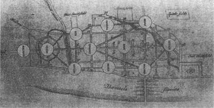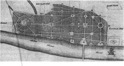 «Эвелин хотел заложитьдвенадцать взаимосвязанных площадей… и прямую улицу с востока на запад, которая должна была протянуться на полмили от «ворот короля Карла» [в лондонской стене к югу от Олдгейта] до Темпла, где находилась площадь с восемью расходящимися от нее улицами, как на плане Кристофера Рена». [1233]1233