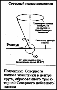 Тайна неба завернута в кольца Дракона, подобно тому, как некогда другой дракон охранял золотое руно аргонавтов. Она навсегда зафиксирована на своем месте в глубинах неба, причем ее расположение почти невозможно обнаружить даже за несколько жизней, не говоря уж об одной. Современные астрономы называют ее «северным полюсом эклиптики». Эта точка никоим образом не совпадает с «северным небесным полюсом» (отстоит от него на 23,5 градуса), который находится на продолжении в небо земной оси, о которой, в свою очередь, всякий школьник знает, что она отклонена от вертикали на 23,5 градуса.