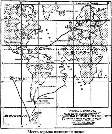 В той области Тихого океана, у Южного тропика, где советскую подлодку «Пионер» постиг предательский удар, уже едва заметно движение боковых замирающих струй Южного экваториального течения, направляющихся к юго‑востоку. Однако не было бы ничего удивительного, если бы в описываемое нами время какой‑либо посторонний наблюдатель, обладающий способностью пронизывать взором огромные толщи воды, заметил здесь, на глубине около ста пятидесяти метров от поверхности, огромный силуэт, довольно быстро увлекаемый течением в противоположном, юго‑западном направлении. Очевидно, в этих местах существовало постоянное или случайно появившееся вследствие неизвестных причин подводное течение, идущее совершенно самостоятельным путем, наперерез слабым поверхностным струям Южного экваториального течения.