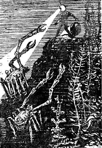Полчища гигантских крабов заполняли все пространство между камнями и обломками скал, стояли на них, висели, вцепившись когтями в каждый их выступ и углубление. Далеко выдавшиеся вперед выпуклые глаза сверкали под лучом прожектора, словно крупные агатовые желуди. Крабы неподвижно стояли на своих высоких суставчатых ногах, как будто ослепленные ярким голубым светом прожектора.