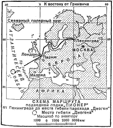 Поймав с гибнущего «Диогена» радиосигнал о бедствии, подлодка явилась к месту катастрофы одновременно с остальными спешившими туда судами, хотя ее отделяло от «Диогена» расстояние, в несколько раз большее. Держась на глубине около двухсот метров, следя за всеми радиопереговорами «Диогена» и его спасителей, подлодка проводила затем тонувшее судно до глубины одного километра и видела, как скопившийся во многих его отсеках воздух под давлением воды в сто атмосфер разорвал судно на несколько частей, которые затем стремительно пошли ко дну.