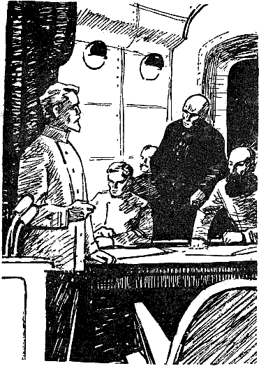 Через несколько минут, вызванные условными сигналами из своих кают, диспетчерских, из разных отсеков подлодки, один за другим торопливо проходили в дверь командирской каюты первый помощник капитана старший лейтенант Бог-ров, главный электрик военный инженер второго ранга Кор-неев, начальник акустической части лейтенант Чижов, начальник научной части профессор Лордкипанидзе, комиссар Семин, старшина водолазов Скворешня и, наконец, Плетнев.